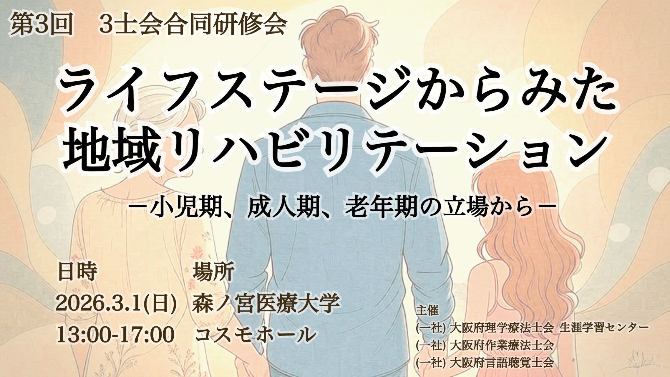 学会・研修会・講習会情報 ニュース・お知らせ 各種お問合せ窓口 学会学術大会・研修集会 生涯学習センター主催研修会 前期・後期研修、新人症例発表会 登録理学療法士 認定・専門理学療法士 臨床実習指導者講習会 開催日:2025年10月01日 カリキュラムコード: 区分: 1|7 地域リハビリテーション 登録理学療法士認定・専門理学療法士 認定理学療法士取得 臨床認定カリキュラム〔運動器〕、〔地域理学療法〕 開催日:2025年12月06日 認定・専門理学療法士東支部枚方市理学療法士会 枚方市理学療法士会主催2025年度地域理学療法認定PT臨床認定カリキュラム教育機関研修 開催日:2025年12月18日 前期・後期研修、新人症例発表会 2025年度 後期研修 第4回「主催」症例検討会聴講者募集のおしらせ VIEW MORE 2025年12月11日「主催」「承認」症例検討会【重要】後期研修 士会『承認』症例検討会 2月開催のお知らせ2025年12月11日「主催」「承認」症例検討会【重要】士会『承認』症例検討会 4月開催 座長申請用QRコードのご案内2025年12月06日お知らせ北支部第6回北支部新人症例発表会 聴講者募集のご案内2025年12月01日お知らせ第6回 中支部新人症例発表会 開催のご案内・事前申し込みについて2025年12月01日お知らせ「おおさかPT学びの道しるべ」12月号発行のお知らせ VIEW MORE Instagram Facebook 大阪府理学療法士会生涯学習センター Twitter Tweets by opta_ccpd
